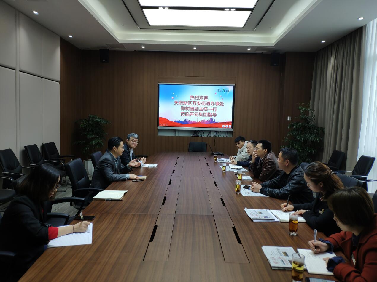 2019年3月26日,天府新區(qū)萬安街道辦事處鄭樹國副主任一行到訪開元集團新址,加強社區(qū)與企業(yè)的聯(lián)系,增進彼此間的溝通協(xié)調,為企業(yè)在轄區(qū)內的健康發(fā)展排憂艱難。開元集團總裁杜勇參加會見。