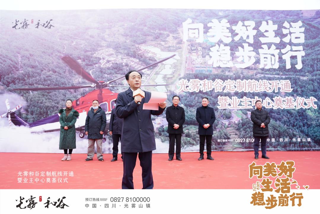 2021年1月2日,新年伊始,開元集團(tuán)在美麗的光霧和谷舉辦了直升機定制航線開通暨業(yè)主中心奠基儀式。光霧和谷項目公司和下屬施工單位的同事們精心準(zhǔn)備、嚴(yán)陣以待,熱烈歡迎各界嘉賓光臨。上午9時,活動正式開啟,南江當(dāng)?shù)卣嚓P(guān)領(lǐng)導(dǎo)、光霧和谷部分業(yè)主代表及光霧山鎮(zhèn)廣大群眾共數(shù)百人蒞臨活動現(xiàn)場,與工作人員一起共同見證光霧和谷項目邁入新的階段。